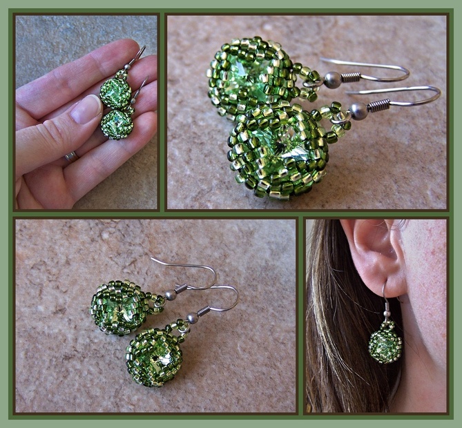 Náušnice tvoří 12 mm Swarovski rivolky barvy - Chrysolite Foiled, které jsou obšité světle zeleným rokajlem s průtahem a tmavě zeleným rokajlem TOHO s průtahem.