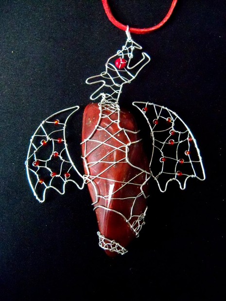 Šperk ve tvaru draka - velice náročný a velký. Střed tvoří červený jaspis, oko a vyplétání křídel blýskavé červené rokajly.