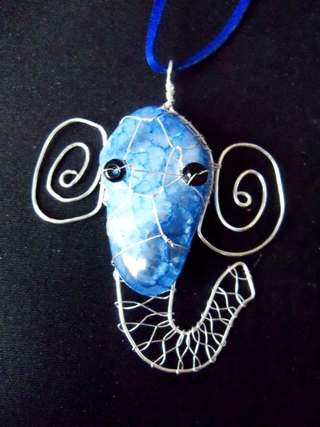 Šperk ve tvaru hlavy slona je tvořen polodrahokamem křišťál, který je modře barven. Oči jsou tvořeny černými rokajly.