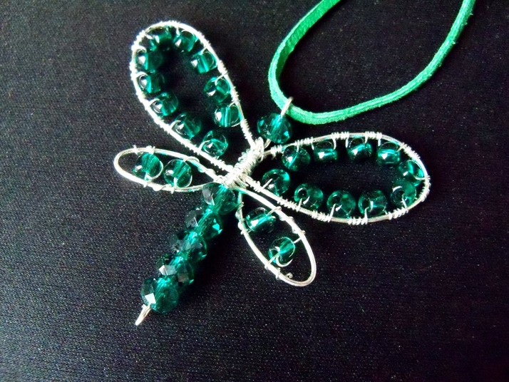 Šperk ve tvaru vážky je tvořen broušenými tyrkysovými korálky ze skla a křídla jsou vyplétána rokajly téže barvy.