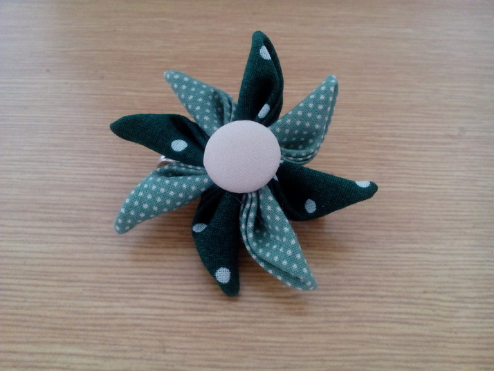 Kanzashi kytička je vytvořena ze zelených kousků látky.