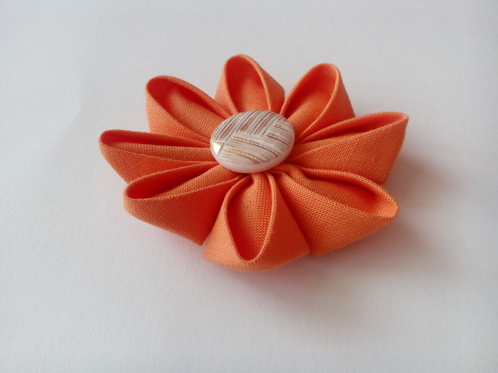 Kanzashi kytička je vyrobena z oranžové látky a béžového knoflíku.