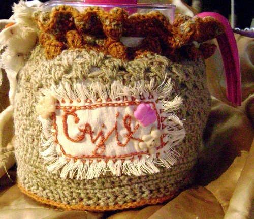 Háčkovaný župánek na konvičku.Obal sloužící k udržení tepla.Uvnitř je obal se stříbrem který zároveň jak zachovává teplo tak drží tvar