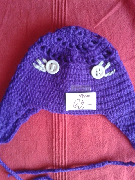 fialovo modrá háčkovaná čepička na uši s přízdobou