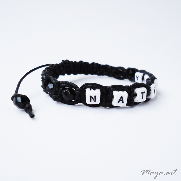 Náramek je zhotoven z černých bavlněných šňůr a písmenek technikou drhání, macramé.