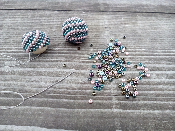 Obšívané kuličky jsou zhotoveny z dřevěných korálků a rokajlu růzové a šedé barvy.