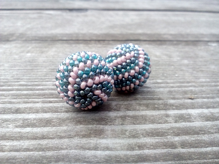 Obšivané kuličky zhotovené z dřevěných kuliček a rokajlu růžové a šedé barvy.