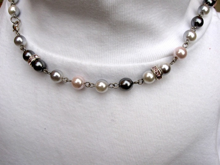 náhrdelník ze skleněných voskových perlí a šatonových ozdob. Barvy tm. šedá světle růžová a smetanovošedá. Díky karabinkám se dá nosit více způsoby - jedná se o dvě náramkové části delší náhrdelníková a doplnující řetízek... velmi variabilní