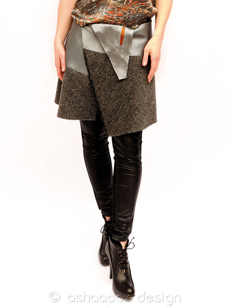 vlněná zavinovací a oboustranná sukně s asymetrickým řešením, s detaily z acetátu