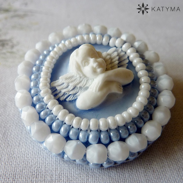 Brož ve světle modré a bílé barvě vytvořená z kameje s andělíčkem.
