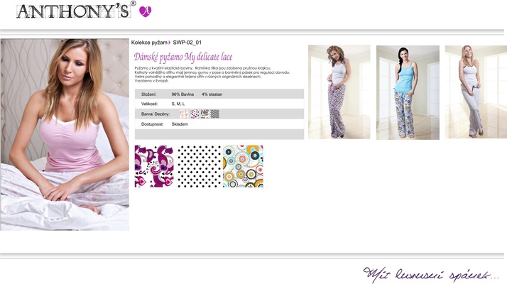 Pyžamo z kvalitní elastické bavlny. Ramínka tílka jsou zdobena pružnou krajkou. Kalhoty volnějšího střihu mají jemnou gumu v pase a bavlněný pásek pro regulaci obvodu. Velmi pohodlný a elegantně řešený střih v různých originálních dezénech. Vyrobeno v Evropě.