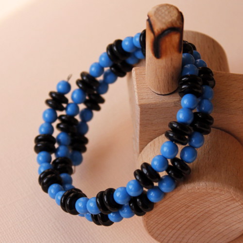Náramek na paměťovém drátu, z nebesky modrých kuliček a černých slavíků...