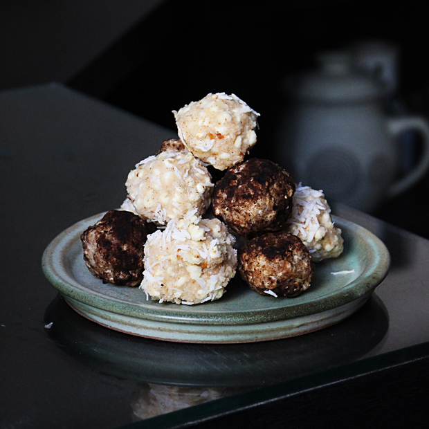 promixovat 100g strouhaného bio kokosu (opravdu doporučuji bio, 200g stojí asi 30kč a když se mixuje, vznikne šťavnatější a kompaktnější hmota), mixujte po chvilkách, pokud máte tyčový mixér jako já. Menší hrst sušených jablek namočte asi na 1-2 hodiny, potě vymačkejte, přidejte ke kokosu a oslaďte sirupem (např.kukuřičný/rýžový, z agáve..) dle chuti, potom přidejte jáhlové pukance - tolik aby vznikla hmota z které se dají dobře tvarovat kuličky, ty pak můžete obalit v kokosu či karobu/kakau:)