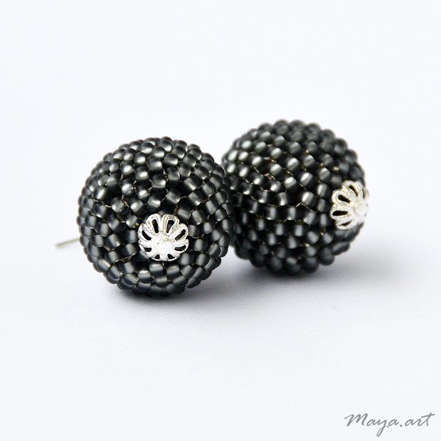Obšívané kuličkové náušnice jsou vytvořeny z šedého matného rokajlu a doplněné o postříbřené komponenty.
