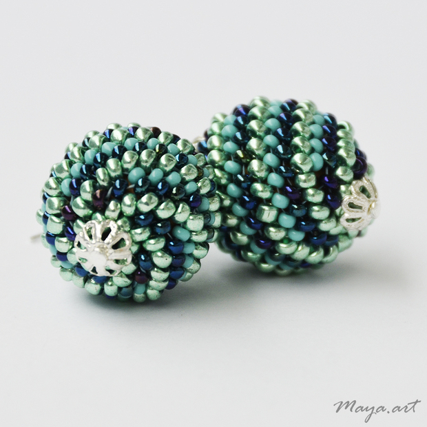 Obšívané kuličkové náušnice jsou vytvořeny z modrého a tyrkysového rokajlu a doplněné o postříbřené komponenty.