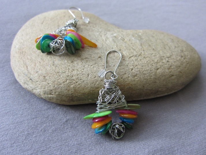 Náušnice z nerezových drátků a barvených chipsů perleti.