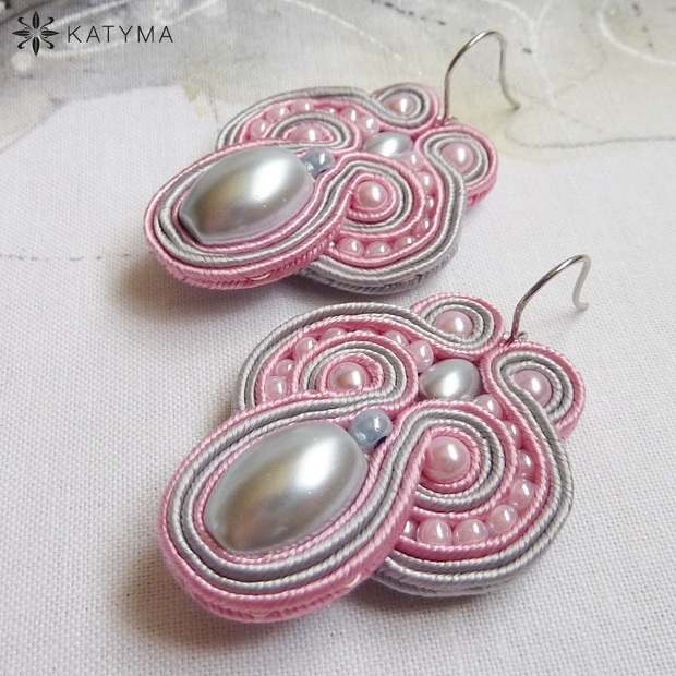 Sutaškové náušnice vytvořené z šedých voskových oliv a ze sutašek růžové a světle šedé barvy.