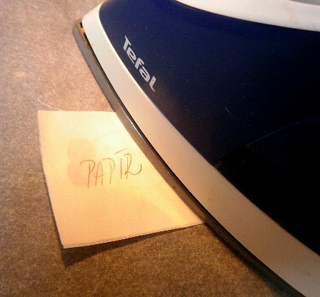 Předem vystřižený kus folie zažehlíme žehličkou na rubovou stranu obrázku. Zažehlujeme přes papírovou část. Stačí chvilička s mírným tlakem. Někdy si pod žehličku dávám tenké plátýnko, aby jste neušpinily žehličku od folie.