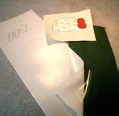 První variantou je, že vystřihujete z folie stejný tvar jako má obrázek. Doporučuji vám, pro práci s folií, dát si na žehlící plochu pečící papír, nezničíte tak žehlící plátno na prkně.