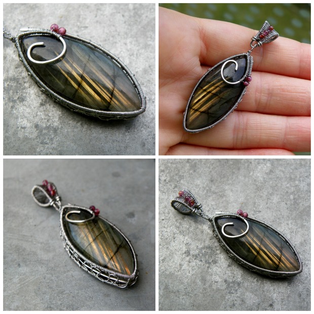 Přívěsek z labradoritu, nerezového drátu a granátků.
