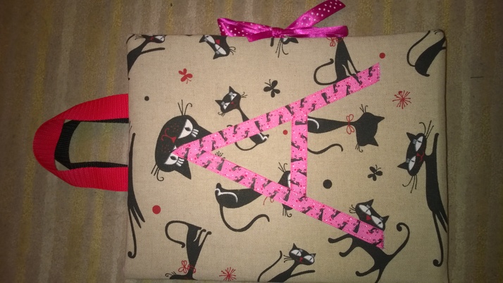 Pastelkovník pro malou Adrianku. Nechybí kapsa na blok a pastelky a guma na podržení ořezávátka a gumy. Pastelkovník se k sobě sváže stuhou a má poutka na pohodlné nošení.