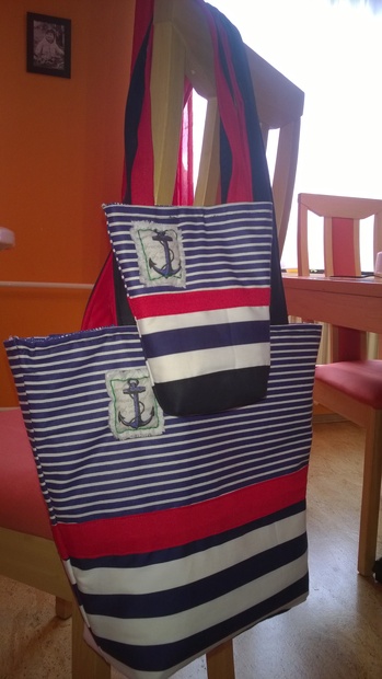 Námořnické tašky ušité pro kamarádku a její dceru na dovolenou k moři. Kabelky byli obrovským překvapením a na dovolené byli plně využity :-)
