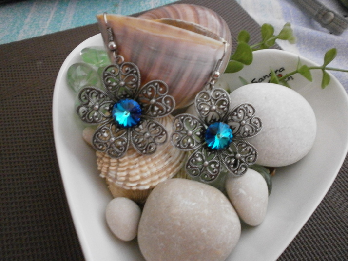 Náušnice z francouzského starostříbra Beyoncé v kombinaci se Swarovski barva Bermuda Blue . Velikost květu 3,5cm.Možno vyrobit v různých barvách.
