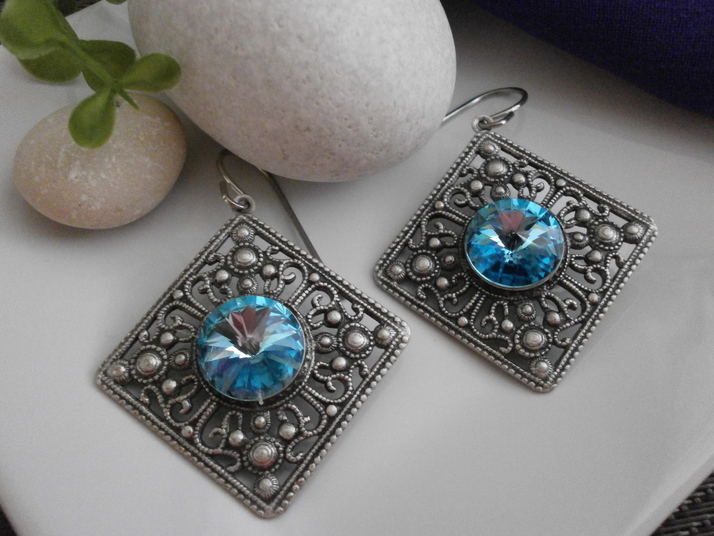 Náušnice Adele čtverec z francouzského starostříbra v kombinaci se Swarovski - barva Aquamarine. Velikost 4,5cm. Možno vyrobit v různých barvách.