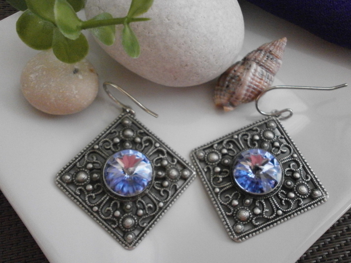 Náušnice Adele čtverec z francouzského starostříbra v kombinaci se Swarovski - barva Lavender . Velikost 4,5cm . Možno vyrobit v různých barvách.