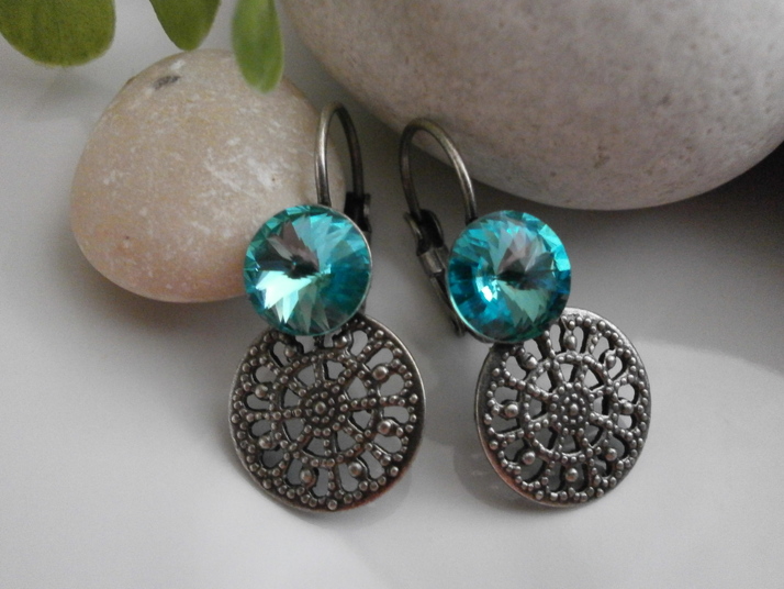 Náušnice Mandala z francouzského starostříbra v kombinaci se Swarovski- barva Aquamarine. Velikost 3,8cm . Možno vyrobit v různých barvách.