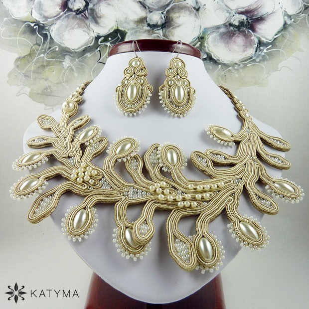 Souprava je vytvořena ze sutašek světle hnědé a smetanové barvy, smetanových voskových perliček různých velikostí, smetanových voskových oliv a jemně smetanového českého kulatého rokajlu Preciosa.