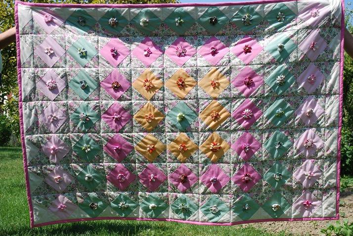 Klasická patchworková deka je obohatená o 63 učne vyrobených úžasných kvetiniek a motýľov. Vytvárajú jedinečný 3D efekt.