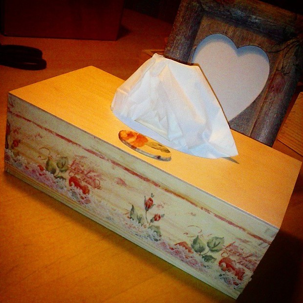 Dřevěná krabička na papírové kapesníky s motivem růží na smetanovém podkladu.