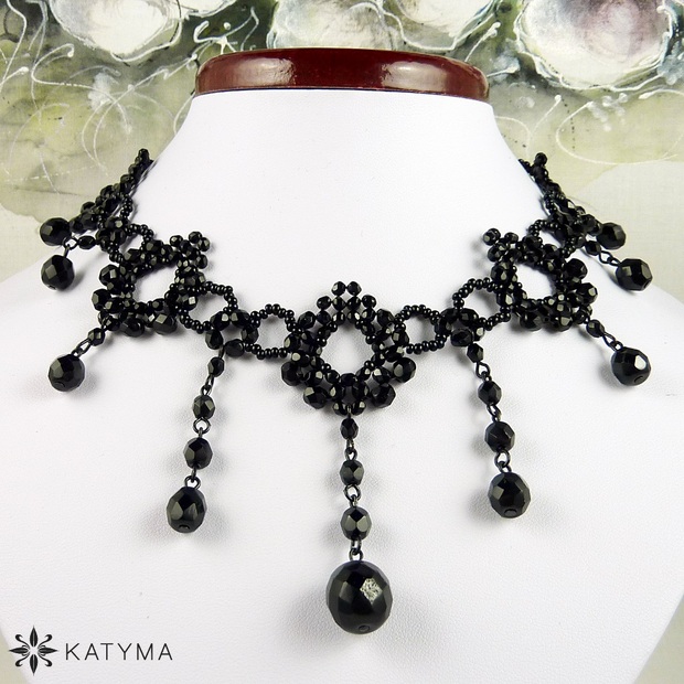 Náhrdelník z černé bižuterie šitý a ketlovaný z broušených perliček firmy Preciosa.