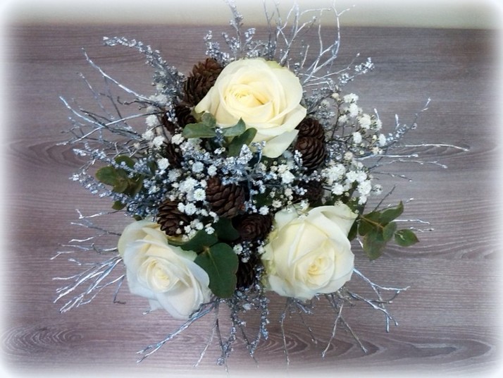 Kytice je uvázána z bílých růží Avalanche, nevěstina závojíčku, bílého borůvčí, stříbrného solidága, eucalyptu. Celková jemnost kytice je podtržena přírodním prvkem a to několika šiškami zakomponovanými přímo mezi živé květy.