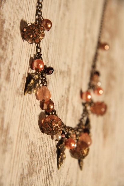 Bronzový řetízek je ozdoben skleněnými korálky, voskovými perličkami a kovovými korálky různých velikostí, mezi které napadalo kovové lístí bronzové barvy.