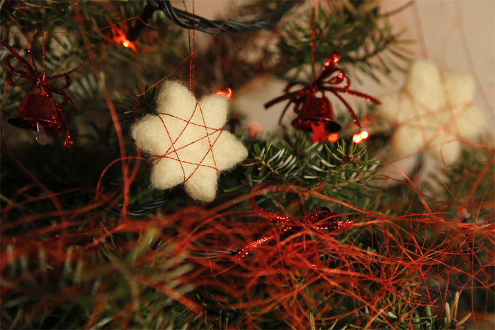 Plstěné ozdoby, červené kovové zvonky s červenými lesklými mašlemi, červené kokosové vlákno, červená světla