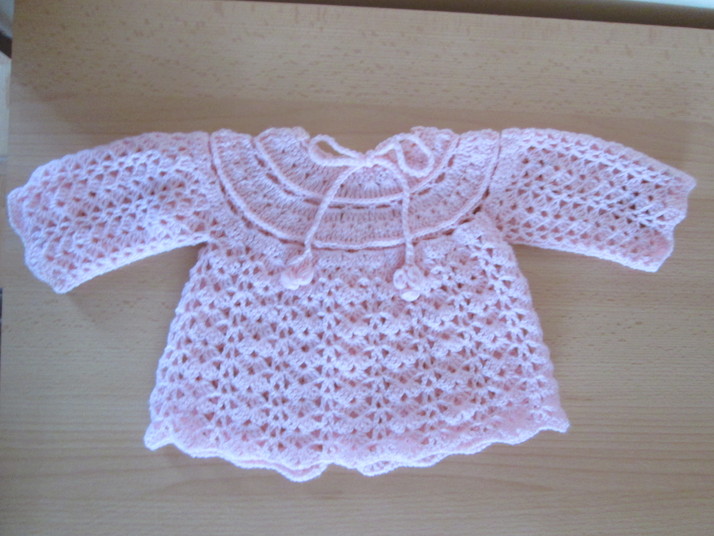 Jedná se o růžový háčkovaný kabátek pro dítě do 2 měsíců věku. Délka 22 centimetrů, šířka 23 centimetrů, délka rukávu 18 centimetrů.