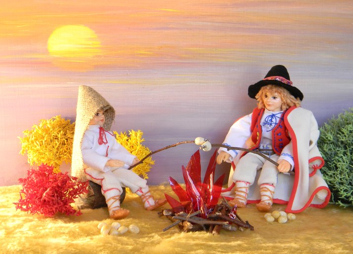 Valašský rok-Podzim. Panenky-loutky jsou vyrobené z moduritu, drátku a látky.