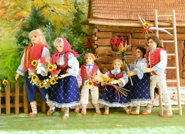 Valašský rok-Dožínky. Panenky- loutky jsou vyrobené z moduritu,drátku a látky. Vysoké jsou 10-20cm.