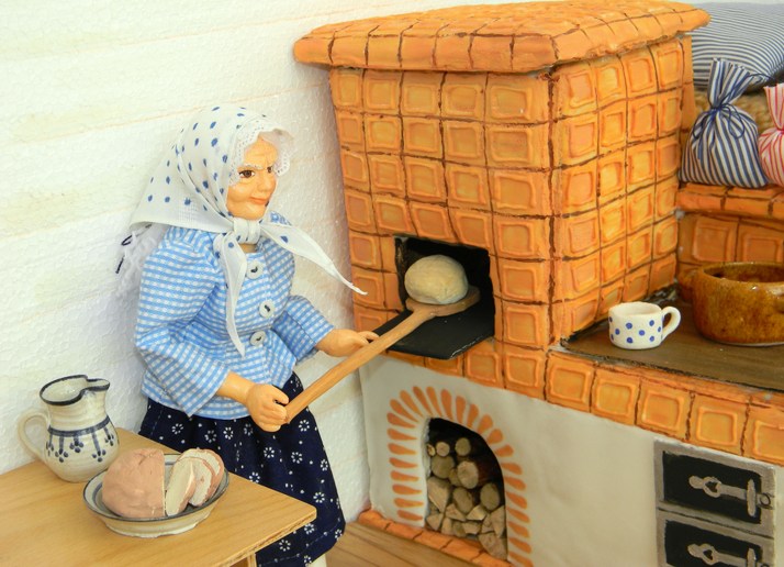 Valašský rok-Pečení chleba. Panenka-loutka je vyrobená z moduritu, drátku a látky. Pec je z perníku.