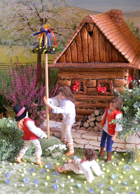 Valašský rok-Stavění máje. Panenky-loutky jsou vyrobené z moduritu, drátku a látky.