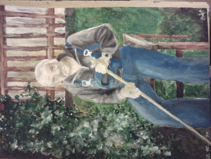 Pracující děda na zahradě. Tempera na čtvrtce.