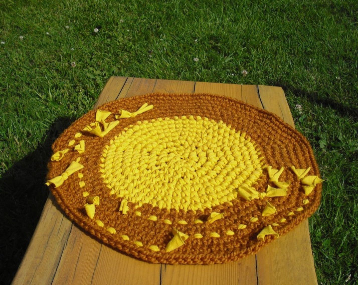 Háčkovaný podsedák (žluté tričko a skořicová silná příze).