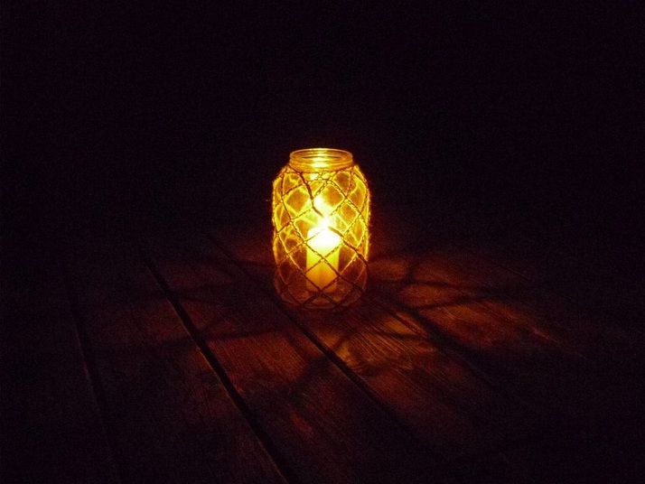Stará láhev na zavařovaní, nově lucerna na terase, obháčkovaná provázkem