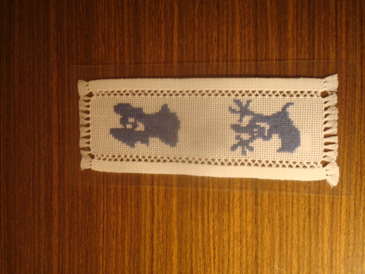 Motiv strašidel, záložka vyšívaná křížkově přes jednu nitku, zatavená do průhledné fólie.