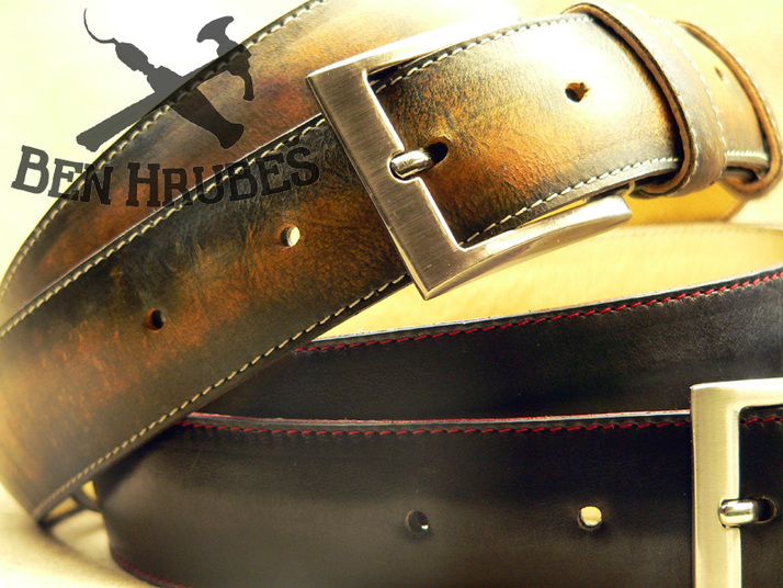 Opasky k obleku v luxusním provedení sendvičové konstrukce z totožné kůže z jaké jsou polobotky šité na míru. Tyto dva jsou k zde vyobrazeným wholecut oxfordům v černočervené barvě Killmordům a žíhaným Smokeům