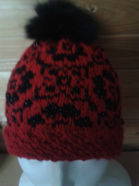 červenočerná čepice s norským vzorem a s bambulí z králíka
