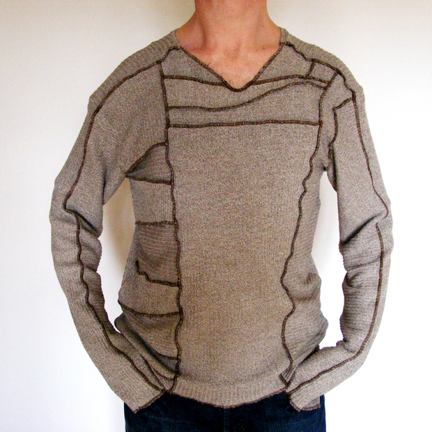 Pánské triko s dlouhým rukávem je zhotoveno z krásného vroubkovaného bavlněného úpletu v barvě béžového melíru. Rafinované rozstříhání a následné sestavení a použití barevných nití, dodává celkový nepoakovatelný dojem.