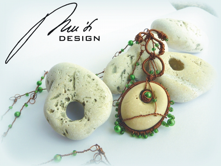 Šperk vyrobený technikou wire wrap. Kámen ze Středozemí, zelený rokajl, zelené kuličky, měděný drát.